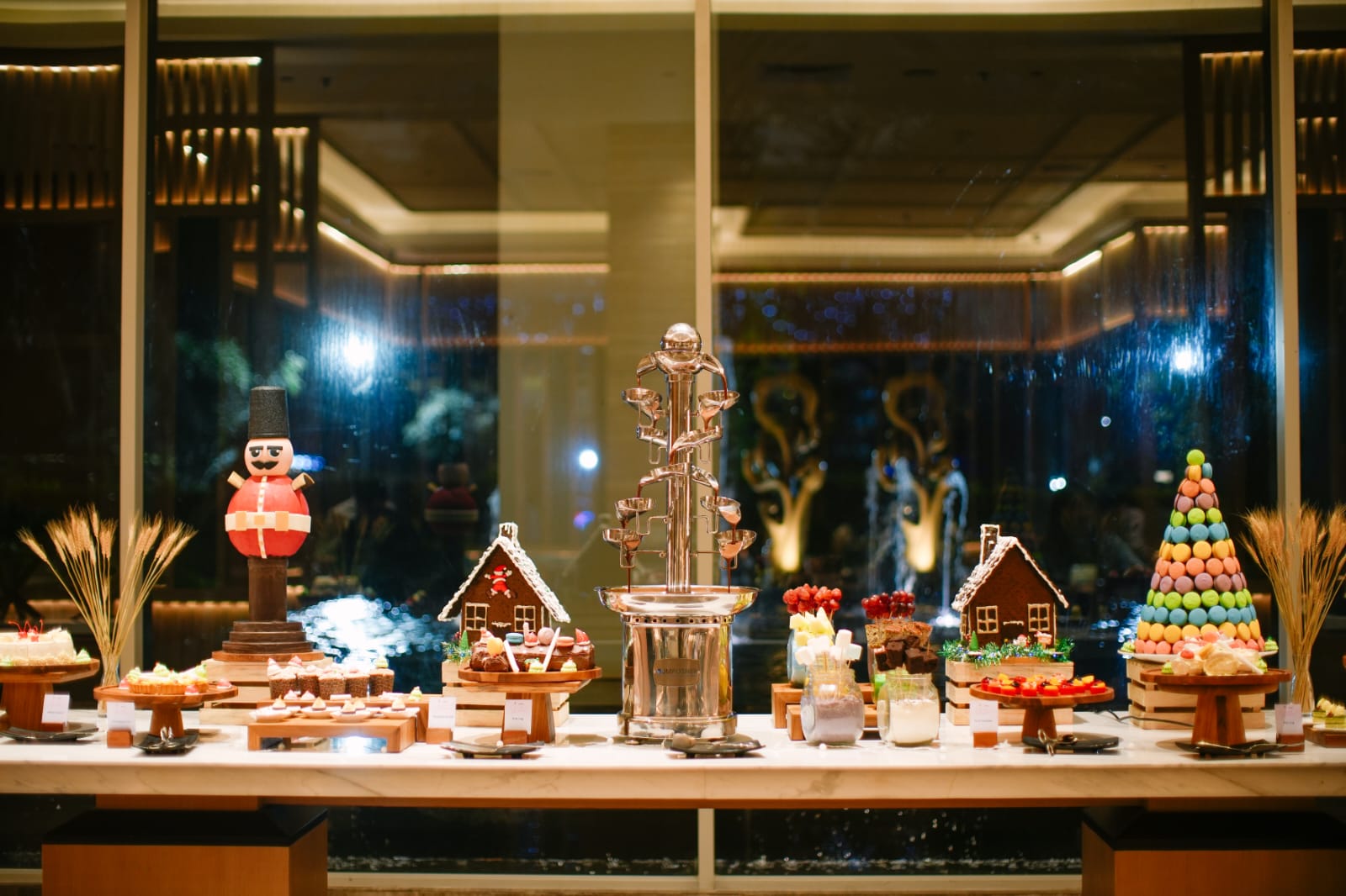 Untuk hidangan penutup penggugah selera menanti dengan Ginger Panna Cotta, Ginger Cookies, Lemon Meringue Tart, Yule Log, Macaron Christmas Tree dan Chocolate Fountain. Ice cream bar dengan berbagai topping serta Kids Buffet turut melengkapi pengalaman ini.