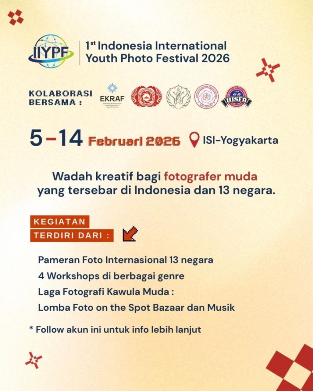 Yogyakarta, Februari 2026 — Federasi Perkumpulan Senifoto Indonesia (FPSI) berkolaborasi dengan Himpunan Mahasiswa Jurusan Fotografi (HMJ) dan ISI- Yogyakarta, menyelenggarakan 1st Indonesia International Youth Photo Festival (IIYPF) 2026. Selain HMJ Fotografi – ISI Yogayakarta, kepanitiaan IIYPF juga di dukung oleh UKM UFO - Universitas Gajah Mada - Yogyakarta dan UKM DWPh - Universitas Duta Wacana - Yogyakarta serta dimentori oleh Himpunan SeniFoto Amatir Yogyakarta (HISFA). Ke empat klub tersebut adalah anggota FPSI.