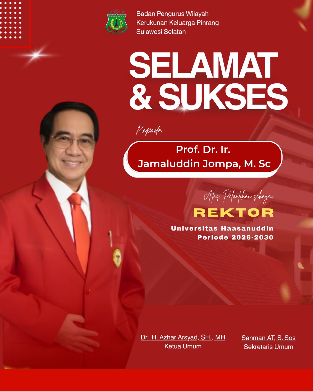 Melalui Rapat Paripurna Terbuka Luar Biasa Majelis Wali Amanat Universitas Hasanuddin hari ini, Senin 27 April 2026 bertempat di Baruga Andi Pangerang Pettarani kampus Unhas Tamalanrea Prof Dr Ir Jamaluddin Jompa, M.Sc (akrab disapa dengan panggilan Prof JJ) dilantik sebagai rektor Universitas Hasanuddin (Unhas) periode kedua untuk masa kerja 2026-2030 oleh Ketua Majelis Wali Amanat (MWA) Unhas Prof Dr Andi Alimuddin Unde, M.Si.